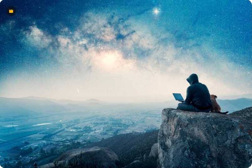 gornja slika: person-sitting-top-mountain-with-laptop-dog